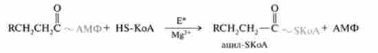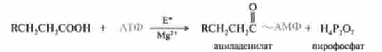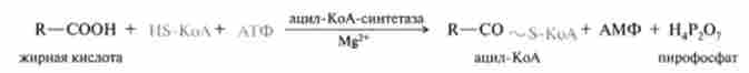 Реакції окислення жирних кислот відбуваються тільки після перетворення її в активовану високоенергетичну форму - ацил-КоА. Цей процес вимагає витрати однієї молекули АТФ, присутності коензиму А і іонів Mg2 +; каталізує перетворення вільної жирної кислоти в який активується форму - фермент ацил-КоА-синтетаза (тіокіназа). У наведених нижче реакціях він позначений як Е *. Відомий ряд тіокіназ, специфічних до жирних кислот з різною довжиною вуглеводневого ланцюга. Ці ферменти в клітинах прокаріотів прикріплені до клітинної мембрани, у еукаріот - до зовнішньої мембрані мітохондрій.