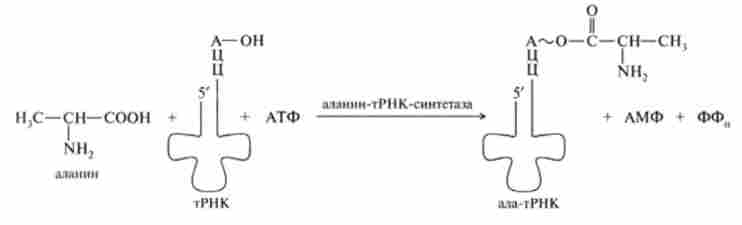 Велика частина пулу амінокислот в цитоплазмі клітин знаходиться не у вільному стані, а у вигляді аміноацил-тРНК. Це охороняє амінокислоти від метаболічних перетворень і сприяє збереженню набору амінокислот для синтезу білка. Утворенню комплексу амінокислота-тРНК передує активація амінокислоти і знаходження відповідної тРНК (рекогніція). Це відбувається під дією ферменту аміноацил-тРНК-син- тетази, або АРС-ази. Ці ферменти мають два активних центру, один з яких відповідає певній тРНК, а інший строго специфічний відповідної амінокислоті. Таким чином, в клітці має бути не менше 20 АРС-аз, хоча фактично їх дещо більше. Освіта амино- ацил-тРНК відбувається в два етапи, першим з яких є взаємодія амінокислоти (Ак) з макроергів АТФ: