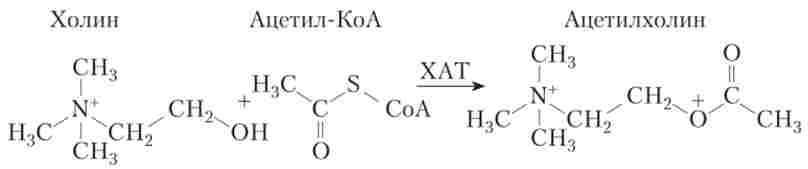 Один з найважливіших медіаторів організму тварин - ацетилхолін (АХ) - синтезується в закінченнях нейронів з холіну і ацетил-коен- зима А - речовини, що дає АХ ацетильную угруповання. Холін - незамінна речовина, що міститься в насінні злаків, в бобових, в м'ясі. Деякі фахівці відносять холін до вітамінів, і у нього навіть є «вітамінне» позначення - У4.