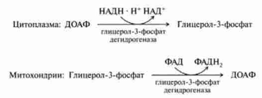 Цитоплазматичний НАДН спочатку відновлює дігідроксіаце- тон-3-фосфат (ДОАФ) до гліцерин-3-фосфату, який легко проникає через мітохондріальну мембрану, де знову окислюється до дігідроксіацстон- 3-фосфату, але при дії ферменту, коферментом якого є ФАД: