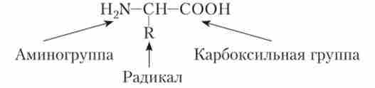 Білки (протеїни) (від грец. То лреото - головний, перший) представляють собою високомолекулярні органічні полімерні речовини, побудовані з хімічно подібних мономерів, званих амінокислотами. Клітини містять від 10 до 20% білків, хоча в деяких клітинах їх набагато більше - 50-80%. Молекула будь-амінокислоти може бути представлена наступним чином: