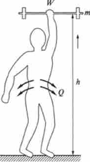 W - механічна робота. Q - теплота при піднятті людиною гантелі масою т на висоту І