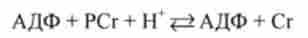 йде в бік ресинтезу АТФ. Ця реакція підтримує гомеостаз РСГ при скороченні м'язів. Участь в ній іонів Н + визначає її залежність від кислотності середовища.
