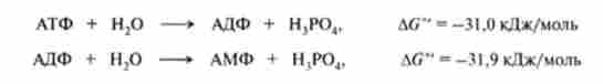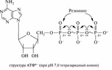 АТФ є термодинамічно нестійке з'єднання. Нестабільність АТФ визначається, по-перше, електростатичним Отта / шіва- ням в області кластера однойменних негативних зарядів, що призводить до напруження всієї молекули, однак найсильніше зв'язку - Р-О-Р, і, по-друге, конкурентним резонансом. Відповідно до останнього фактором існує конкуренція між атомами фосфору за неподіленого рухливі електрони атома кисню, розташованого між ними, оскільки на кожному атомі фосфору є частковий позитивний заряд внаслідок значного елсктронакцепторного впливу груп Р = 0 і Р-О-. Таким чином, можливість існування АТФ визначається наявністю достатньої кількості хімічної енергії в молекулі, що дозволяє компенсувати ці фізико-хімічні напруги. У молекулі АТФ є дві фосфоан- гідридних (пірофосфатних) зв'язку, гідроліз яких супроводжується значним зменшенням вільної енергії (при pH 7,0 і 37 ° С):