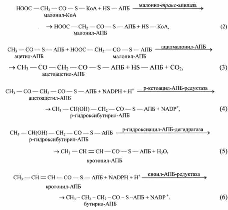 Послідовність реакцій, що відбуваються при синтезі жирних кислот, складається з 6 стадій: