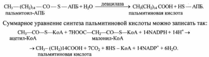 Далі цикл реакцій повторюється. Завершується синтез жирної кислоти отщеплением HS-АПБ від ацил-АПБ під впливом ферменту діацілази.