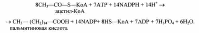 З огляду на, що на освіту однієї молекули Малоні-КоА і ацетил-КоА витрачаються 1 молекула АТР і одна молекула СО2, яка потім відщеплюється, сумарне рівняння можна представити і в такому вигляді: