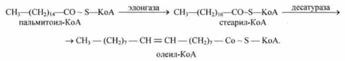 Найбільш поширені мононенасичені жирні кислоти - пальміто- оленів і оленів - синтезуються з пальмітинової і стеаринової кислот. Цей синтез протікає в мікросомах клітин печінки і жирової тканини за участю молекулярного кисню. Перетворенню піддаються тільки активовані форми пальмітинової і стеаринової кислот. Ферменти, що беруть участь у перетворенні насичених жирні кислот в ненасичені, називають Десата разам і.