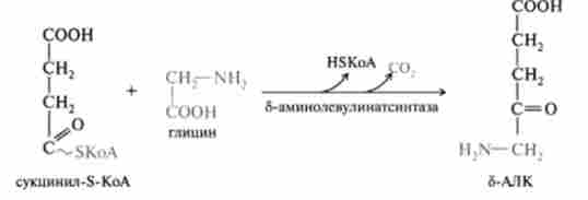 У першій стадії, що протікає в два етапи, сукцинил-КоА взаємодіє з гліцином з утворенням б-аминолевулиновой кислоти (б-АЛК):