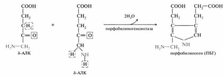 У другій стадії має місце межмолекулярная конденсація двох молекул 5-аминолевулиновой кислоти з утворенням порфобилиногена (ПБГ), заміщеного пиррола: