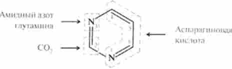 Застосування мічених атомів дозволило з'ясувати походження кожного з атомів піримідинового кільця: