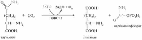 1. Освіта карбамоілфосфата при дії карбамоілфосфатсінте- тази II (КФС II). Донором аміногрупи в цій реакції є глутамін (амидная група). При синтезі сечовини (гл. 24) в реакції синтезу карбамоілфосфата бере участь NH3, а не глутамин і ця реакція каталізується карба- моілфосфатсінтетазой I (КФС I). Встановлено, що КФС I міститься тільки в мітохондріях печінки і каталізує синтез сечовини, а КФС II присутній в цитоплазмі практично всіх клітин організму і бере участь в синтезі пі рімідінов: