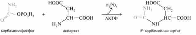 2. Карбамоільная група переноситься від карбамоілфосфата на а-аміно- групу аспарагінової кислоти; ця реакція каталізується аспартаткарбамо- ілтрансферазой (АКТФ):