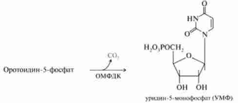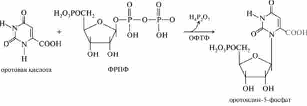5. Приєднання рибоза-5-фосфату. Воно здійснюється при взаємодії оротової кислоти з ФРПФ в реакції, що каталізується оротатфос- форібозілтрансферазой (ОФТФ):