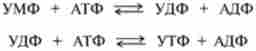 Таким чином, освіта УТФ з УМФ відбувається в результаті послідовних трансферазную (кіназного) реакцій при дії нуклеозід- монофосфат- і нуклсозіддіфосфаттрансфераз: