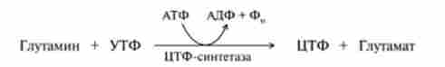 Біосинтез цітідінтріфосфага (ЦТФ). Відомий тільки один шлях освіти цітідінових нуклеотидів, а саме амінірованіе УТФ, в якому донором аміногрупи виступає глутамін: