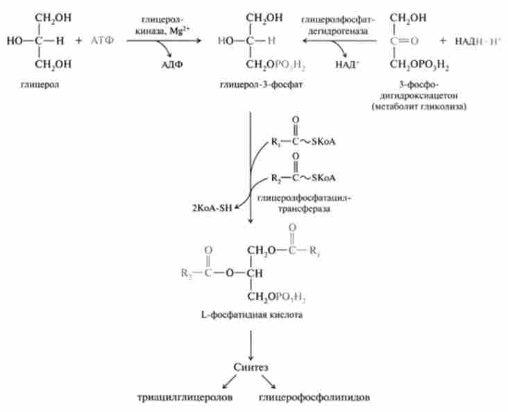 Фосфатидними кислота утворюється з активованих жирних кислот (ацил-КоА) і фосфорилированного в третьому положенні гліцерину (гліцерин-3-фосфат). Відомі два шляхи синтезу гли- церола-3-фосфату. Вільний гліцерин фосфорилируется по 3-гідроксігруп- пе в присутності гліцеролкінази і АТФ з утворенням L-гліцерин-З-Фос фата. Висока активність гліцеролкінази виявлена в клітинах тканини печінки і епітелію кишечника, в той час як в жировій тканині і м'язах цей фермент мало активний і освіту гліцерин-3-фосфату пов'язано з процесами гліколізу. У цьому випадку джерелом L-гліцерин-З-фосфату може служити процес відновлення 3-фосфодігідроксіацетонфосфата. Утворився L-гліцерин-З-фосфатаціліруется двома молекулами КоА-похідного жирної кислоти, утворюючи 1,2-ДІАЦ-З-фосфогліцерол, званий фосфатидного кислотою: