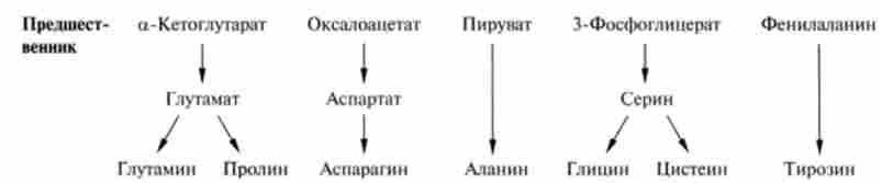 Синтез замінних амінокислот здійснюється за допомогою вельми простих реакцій, що протікають, як правило, в одну або дві стадії, які забезпечують амінірованіе вуглецевого скелета попередника.