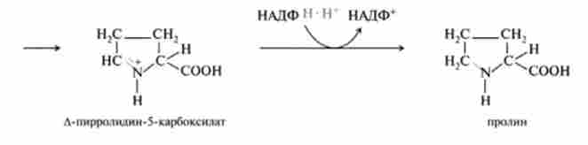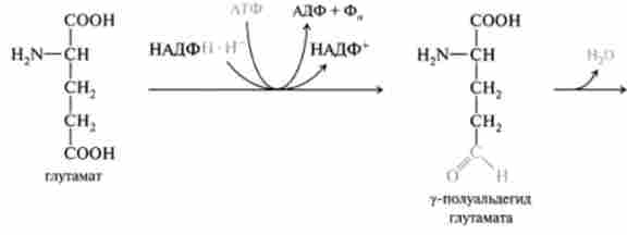Синтез пролина з глутамату включає наступні перетворення: АТФ-за- висимо відновлення до у-напівальдегід; циклизация з відщепленням Н20 і відновленням НАДФН завершує процес синтезу проліну: