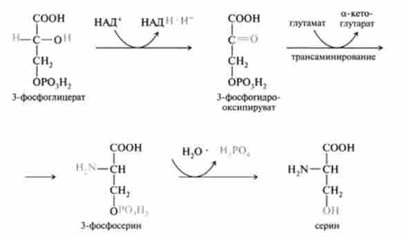 Серін синтезується з проміжного продукту гліколізу - 3-фосфо гліцерата. Спочатку відбувається його окислення до 3-фосфогідропірувата, потім трансамінування з глутамат з подальшим дефосфорілірованіем:
