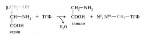 Серін є попередником гліцину і цистеїну. При синтезі гліцину p-вуглецевий атом серина переноситься на тетрагідрофолат (ТГФ) - переносник одноуглеродних фрагментів:
