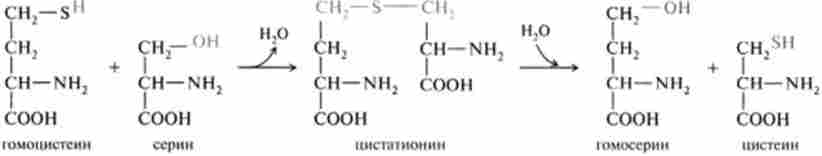 Цистеїн синтезується з серину і гомоцистеїну (деметильованого метіоніну), що виступає донором сульфогрупи. Реакції протікають в дві стадії і катализируются також пірідоксальфосфатзавісімимі ферментами - цістатіонсінтазой і цістатіоніназой: