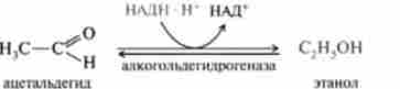2. Відновлення ацетальдегіду до етанолу при дії ферменту алко- кол ьдегідрогенази, що містить в якості коферменту НАДН, відновлений в реакції гликолитичної редукції процесу гліколізу. Таким чином, в цій реакції йде регенерація окисленого НАД *, необхідного для продовження процесів гліколізу і бродіння, так як вміст НАД * в клітинах обмежена: