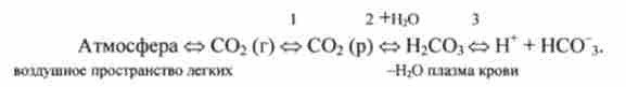 Між СО2 в альвеолах і водородкарбонатним буфером в плазмі крові, що протікає через капіляри легень, встановлюється ланцюжок рівноваг: