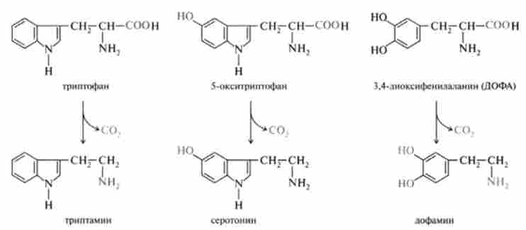 Неспецифічна декарбоксилаза ароматичних амінокислот каталізує декарбоксилювання триптофану, 5-гідроксітріптофана і 3,4-діоксі- фенілаланіну (ДОФА). Продуктами реакцій, крім С02, є відповідно триптаміну, серотонін і діоксіфенілетіламін (дофамін):