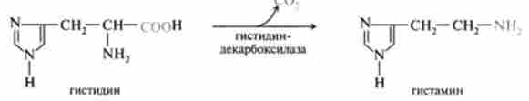 Іншим прикладом освіти біологічно активних амінів в процесі декарбоксилювання амінокислот є утворення гістаміну (з гістидину), великі кількості якого виділяються із стовбурових клітин сполучної тканини, викликаючи алергічну реакцію у відповідь на дію алергену: