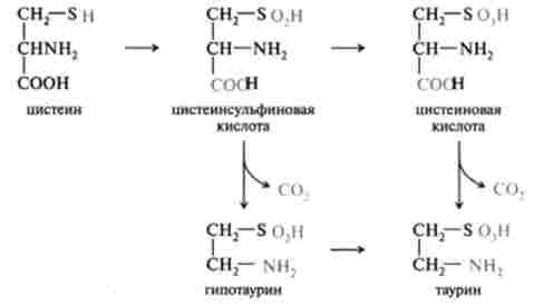 До біогенних амінів відноситься також таурин, який утворюється з цистеїну і використовується в печінці при утворенні парних жовчних кислот:
