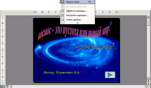 Метою даного етапу є перевірка працездатності всієї програми. Демонстрацію програми проводять в режимі Показ слайдів. Включити даний режим можна за допомогою горизонтального меню Вид - Показ слайдів або Показ слайдів - Показ (рис. 30). Па 4 *. про> IDIUtit 5 I P. I.J "Wi": w II. 1-і-. - .. І-ВПВ », 1'if im - a. A * 'Ї ^-ЧР'ПЧ'стор cnafia? | I Ц Іікт їм АТГ «* м счог про Пане» (f Q ц-щ »... ммщівб- Атггор: Няументсо А-А. за - і * . I _ Т «сЬя_яздмгі j | | rjt | МіпмД I'nwrl'iK Яв ' ^ К-Іаїхі - i * Про ^ іщсчмче-ICoiAatt.« ічщ », OnS ± 1 і» 0 Офсрнпма no уноячама pficrn) (Росія)