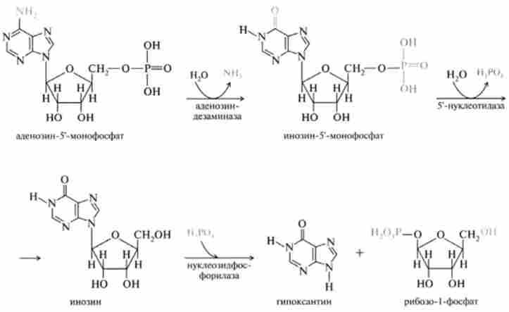 Послідовність реакцій розпаду нуклеотидів пуринового ряду на прикладі деградації аденозин-5'-монофосфату представлена на наступній схемі: