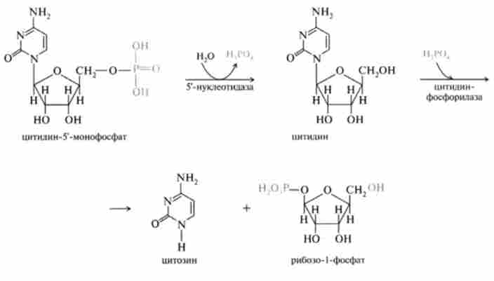 Утворилися нуклеозиди в тварин тканинах найчастіше деградують фосфорілітічно шляхом перенесення залишку рибози на вільну фосфорну кислоту з утворенням рибоза-1-фосфату і азотистого підстави пуринового або піримідинового ряду.