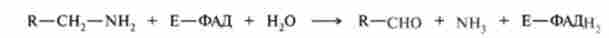 - Перша стадія супроводжується дегидрированием аміну і відновленням коферменту МАО, ФАД до ФАДН2, отщеплением аміаку і освітою з аміну альдегіду: цей процес не вимагає присутності кисню: