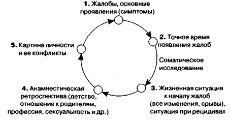 Діагностика в психосоматики обговорити з пацієнтом питання прогнозу і можливостей лікування. Перша бесіда має вирішальне значення для подальшого формування відносин психотерапевта і пацієнта. Рекомендується вже перед першою зустріччю зробити установку на діагностично-терапевтичне використання пацієнтом своїх чуттєвих реакцій. Важливі вказівки на свій конфлікт пацієнт часто дає тим, що використовує у відносинах з психотерапевтом свою звичну систему перенесення і захисту (Любан-Плоцца та ін, 2000). Протягом перших хвилин пацієнти зазвичай розслабляються. Вони з подивом помічають, що про проблеми виявляється можливим говорити; при цьому можна зачіпати дуже особисті питання, не впадаючи в особливе збентеження. Розмова з самого початку повинен також переслідувати терапевтичні цілі. Це пацієнт повинен відчувати, т. к. він часто хотів би почати лікування з моменту, коли він переступить поріг кабінету. Рекомендується використовувати навіть ледь вловиме структурування процесів як метод дослідження, що дозволяє оцінювати як потреби, так і свободу пацієнта, які в його власному уявленні суперечать один одному, але психотерапевта дозволяють скласти загальну картину хвороби. 1. Спочатку ставлять запитання про скарги, які дали підставу для звернення до психотерапевта: «Що привело вас сюди?» Часто при відповіді на це питання попередньо інформоване пацієнт вказує конкретні симптоми або повідомляє вже готовий діагноз: «стенокардія», «виразка», «ревматизм». Ці скарги зобов'язують розпитати пацієнта про зміст його попередніх переживань. Слід підвести пацієнта до того, щоб він розповів про свій стан своїми словами. При цьому необхідно відзначати мовні звороти, якими він користується при описі своїх скарг і картини своєї хвороби. 2. Наступне питання дозволяє уточнити час появи хворобливих переживань: «Коли ви це відчули вперше?» Встановлюються і періоди наступних погіршень і поліпшень. Психотерапевт повинен наполегливо розпитувати пацієнта про час початку хворобливих переживань аж до дня і години. Анамнез життя в рамках загальнолікарської ситуації, коли психотерапевт отримує як психічні, так