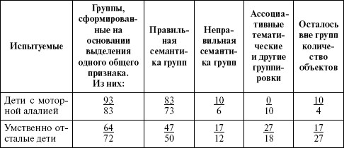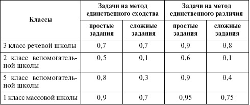 Численні дослідження , що стосуються моторних алалий, свідчать про те, що у дітей з даними мовним розладом є затримка психічного розвитку. Природа цієї затримки трактується різним чином. Для вирішення цієї складної проблеми необхідно вивчення цілого ряду питань, і зокрема виявлення особливостей вербального і невербального мислення дітей з моторною алалією. Ці особливості, очевидно, можуть бути визначені в результаті порівняльного вивчення дітей з моторною алалією, типовою формою олігофренії і нормальним розвитком. З зазначеною метою нами проводилося вивчення процесів класифікації, а також здатності до умовиводів у названих дітей. Випробувані були учні 3-4 класів (всього 12 дітей) школи для дітей з важкими порушеннями мови. Всі вони володіли розмовно-побутової формою мови, але при цьому у них відзначалися характерні прояви мовної недостатності: діти не завжди могли актуалізувати звуковий образ добре відомих їм і вимовних в незнайомих ситуаціях слів, були вираженими труднощі у відтворенні послідовності складного звукового ряду. Учні часто неправильно використовували морфологічні зміни слів для вираження синтаксичних відносин в реченні, спостерігалися помилки в побудові синтаксичних одиниць різної складності. Дослідження мислення як умозаключаем процесу на невербальному матеріалі проводилося за методикою, розробленою В. Н. синяви. Матеріалом для такого дослідження були експериментальні завдання, засновані на використанні учнями методів встановлення причин явищ (метод єдиного подібності і відмінності). З цією метою використовувався прилад, змодельований В. Н. синяви. На приладі малося 2 ряди кнопок, по 5 у кожному, і сигнальна лампочка. Лампочка запалювалася в результаті послідовного натискання кількох кнопок (їх могло бути 2, 3, 4). Але одна кнопка серед них була сигнальної (тобто основний, включає). При пред'явленні завдань на метод єдиного подібності експериментатор натискав, наприклад, на 1-2-ю кнопки - лампочка запалювалася, потім на 2-3-ю - лампочка знову спалахувала. Дитина, порівнявши два цих умови, повинен був знайти сигнальну кнопку. При пред'явленні завдань на метод єдиного відмінності експериментатор натискав, наприклад, на 1-2-ю кнопки, лампочка спалахувала; потім на 2-3-ю кнопки - лампочка не включалася. Діти, проаналізувавши ці нові умови, повинні були визначити основну кнопку. Попередньо дітям давали велику кількість проб. Для отримання статистично достовірних результатів кожну задачу в різних варіантах пред'являли не менше 20 разів. Для зіставлення результатів виконання зазначених завдань дітьми з моторною алалією, олігофренією і нормальними учнями ми використовували дані В. Н. Синьова за допоміжною і масовій школі. У результаті такого зіставлення ми отримали картину, представлену в табл. 8. Як видно з табл. 8, учні 3 класу мовної школи дали значно вищі показники, ніж учні допоміжної школи 2 класу, а в деяких випадках і 5 класу. Більш того, при вирішенні логічних завдань за методом єдиного відмінності їх показники виявилися в одних випадках однаковими з показниками учнів 1 класу масової школи, в інших перевищували їх. Звертає на себе увагу той факт, що у розумово відсталих учнів в міру ускладнення однотипних завдань (при збільшенні числа кнопок, серед яких потрібно було отдифференцировать основну від супутніх) кіл