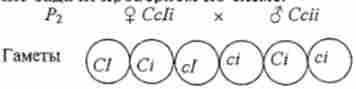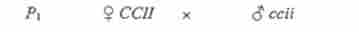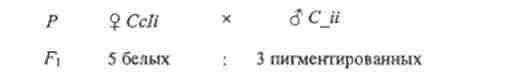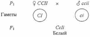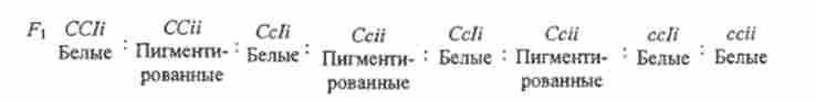Гомозиготні батьківські форми продукують по одному типу гамет - З / і с /. Від злиття цих гамет утворюється Fu гетерозиготное за двома ознаками - Ccii. Покоління має біле оперення, т. К. Домінантний інгібітор / пригнічує дію гена С, який обумовлює забарвлення оперення:
