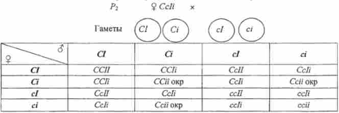 гетерозиготи Fx (Ccii) продукують чотири типи гамет: С /, С /, с /, ci. Жіночі та чоловічі гамети цих типів, вільно комбінуючи, утворюють різні генотипи. Розглянемо освіту їх за допомогою решітки Пеннета: