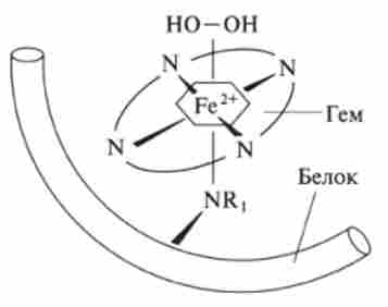 Будова активного центру каталази аналогічно такому гемоглобіну і міо глобіну (рис. 8.14).