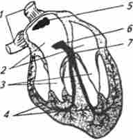 / - верхня і нижня порожнисті вени; 2 - передсердя; 3 шлуночки; 4 - папілярні м'язи; 5 - синусний вузол (Кейт- Флака), 6-атріовентрикулярний вузол (Ашоф - Тавара), 7 пучок Гіса