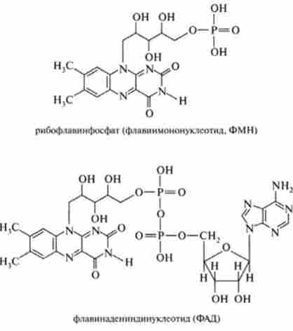 ФМН і ФАД міцно, на відміну від коферментів НАД * і НАДФ+, приєднані до апофермент, виступаючи, таким чином, в якості простетичної груп, а не вільно диссоциирующих коферментів. Обидві групи представляють собою метаболічно активну форму рибофлавіну (вітамін В2).