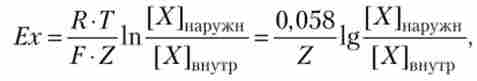 де R - універсальна газова постійна; Т - абсолютна температура в градусах Кельвіна; F - число Фарадея (96500 Кл / моль); Z - електровалентность іона; [X]наруЖН і [Х |внутр - концентрація іона зовні і всередині клітини; ех - рівноважний потенціал для іона X.