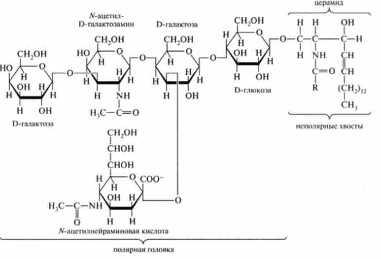 У ганглиозидов виявлені D-глюкоза, D-галактоза, yV-ацстілглюкоза- хв, yV-апетілгалактозамін, JV-ацетілнейраміновой кислота. Завдяки наявності карбоксильної групи в залишку jV-ацетілнейраміновой кислоти все гангліозиди є кислими сполуками: