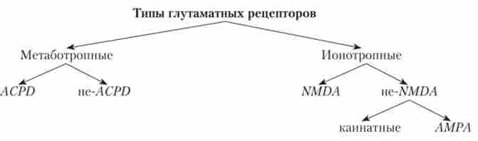 Іонотронние рецептори до глутамату поділяються на два підтипи - NMDA (активується NMDA - М-метил-Л-аснартатом) і не-NMDA. IIe-NiWZM-підтип поширений по всьому мозку і підрозділяється на дві групи: каінатние (активуються каїнової кислотою) і АМРА (активуються АМРА - а-аміногідроксіметілізоксанолпропіоновой кислотою). У кожному з цих підтипів в свою чергу є по кілька різновидів рецепторів, і вони можуть розташовуватися і пресіптічно, і постсинаптично.