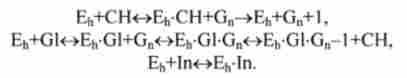 У наведених тут реакціях Е ,, Еь, Еа, Ер - ферменти, що функціонують у відповідних органах або тканинах; Рг - протеїн; In, G1 - гормони інсулін і глюкагон; СН, СН, - глюкоза в крові і тканинах, Gn - глікоген зі ступенем полімеризації і; Xj, Хс, - продукти дезактивації гормонів.