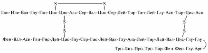 Інсулін був вперше виділений з підшлункової залози бика в 1921 р Ф. Бантінгом і Ч. Бестом. Він складається з двох поліпептидних ланцюгів, з'єднаних двома дисульфідними зв'язками. Поліпептидний ланцюг А містить 21 амінокислотний залишок, а ланцюг В - 30 амінокислотних залишків, молску-