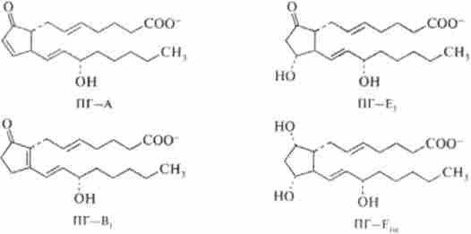 Простагландини - похідні незамінних З ^ -жірних кислот, що містять Циклопентанова кільце. Основними групами простагландинів (ПГ) є: ПГ-А, ПГ-В, ПГ-Е, ПГ-F. Усередині кожної групи є підгрупи, що розрізняються числом подвійних зв'язків в бічних ланцюгах молекули і позначаються цифрами. Крім того, різна орієнтація гидроксилов і циклопентанового кільця позначається після цифр індексами а чи р. У 1957 р вперше були отримані в кристалічному стані ПГ-Е, і ПГ-FIa. Нижче представлена структура простагландинів: