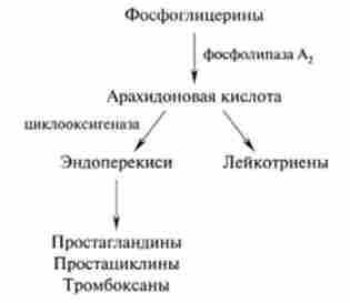 Біосинтез. Як уже зазначалося, попередниками простагландинів є ненасичені жирні кислоти, зокрема арахідонова кислота. Перетворення жирних кислот в простагландини відбувається в ЕПР клітин різних тканин і органів. З фосфогліцерінов під дією фосфоліпази А2 звільняється арахідонової кислоти, яка в залежності від типу ферментативних реакцій може перетворюватися або в простагландини, або в лейкотрієни: