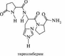 Представлені в табл. 12.1 гормони гіпоталамуса впливають на синтез і секрецію гормонів передньої долі гіпофіза. Всі гормони гіпоталамуса є низькомолекулярними пептидами, і структура деяких з них в даний час повністю встановлена. Наприклад, гормон тиреоліберином є трипептид, що складається з піроглутаміновой кислоти, гістидину і про- лінаміда, причому кінцеві угруповання NH2 і СООН відсутні.